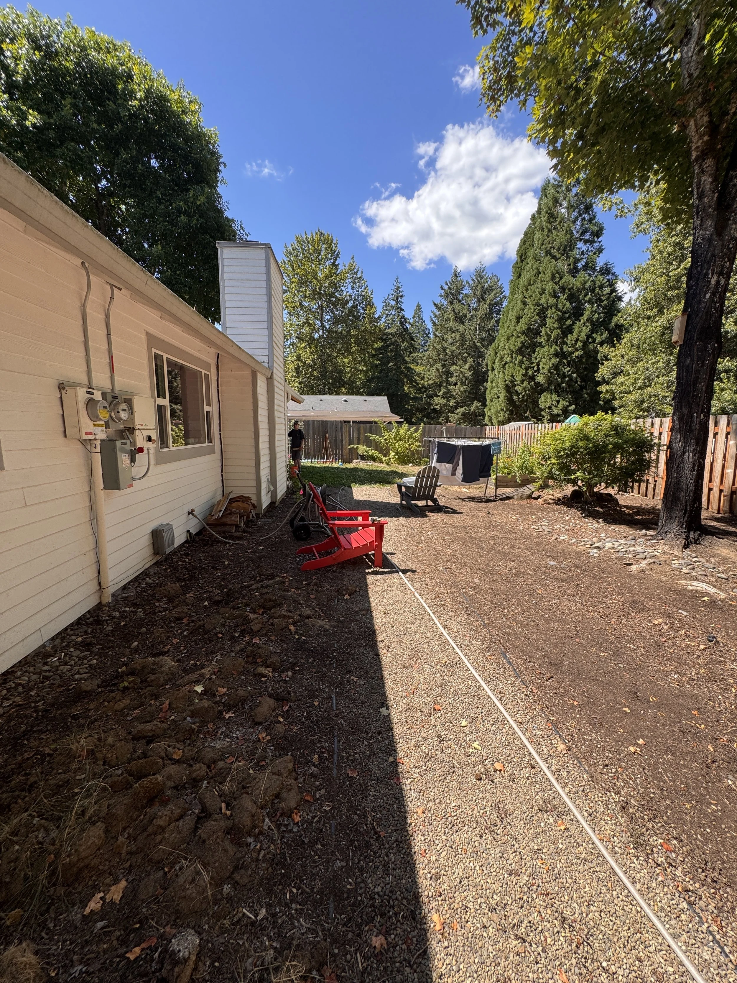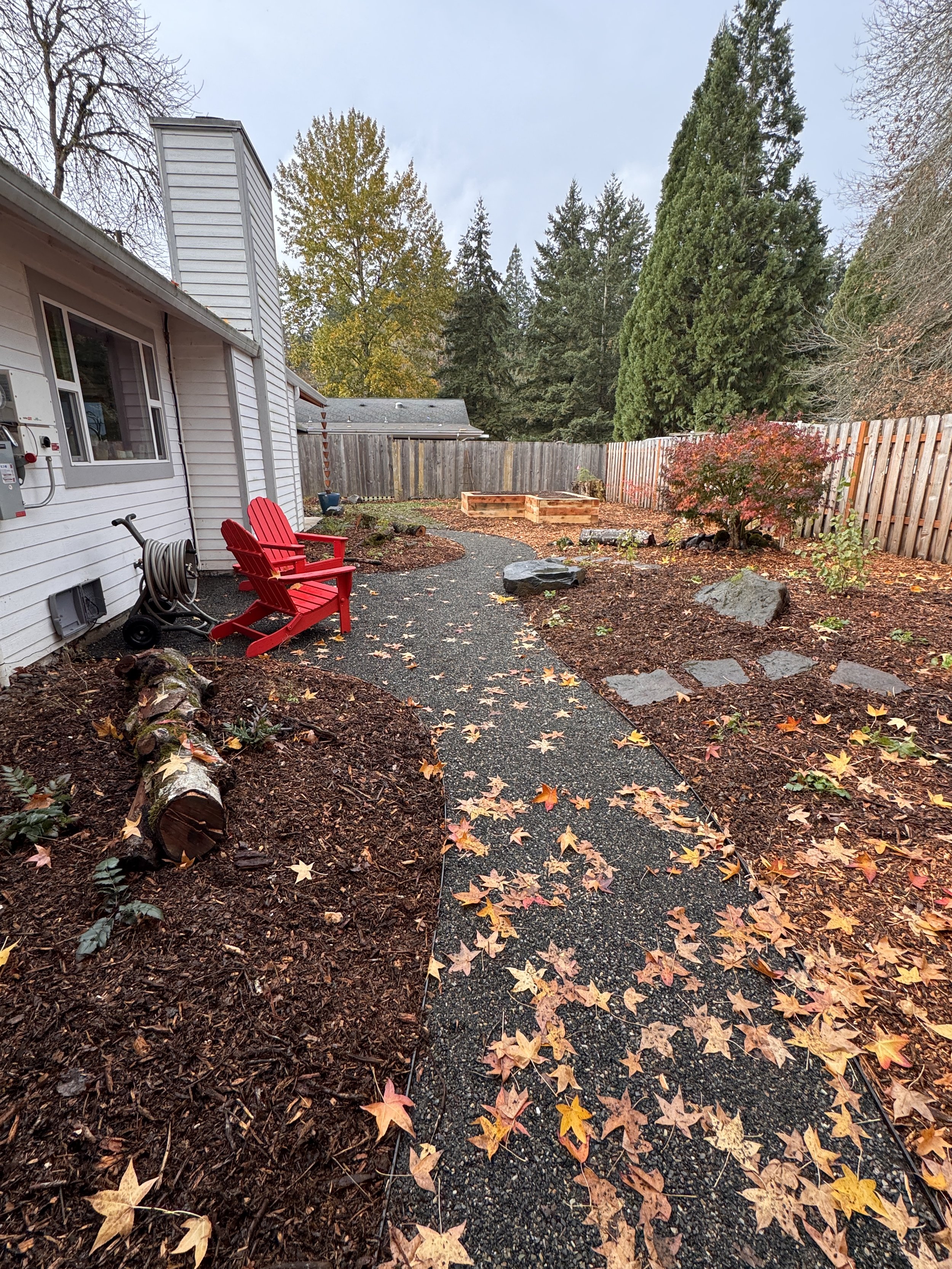 BEFORE... This backyard surrounded by gorgeous Doug Firs just needed some woodland magic, improved walkability and creative inspired design.